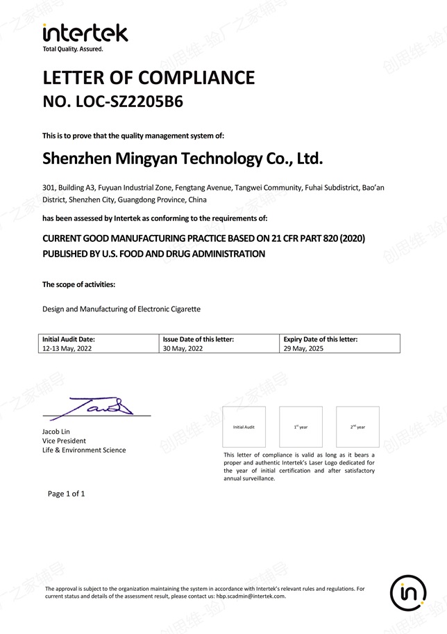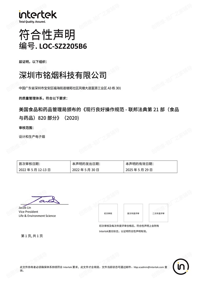 2022年5月12日-13日,國(guó)際認(rèn)證機(jī)構(gòu)INTERTEK(ITS) 專(zhuān)家及深圳市創(chuàng)思維企業(yè)管理技術(shù)有限公司技術(shù)經(jīng)理、GMP輔導(dǎo)老師一起,對(duì)深圳銘煙電子煙、電子霧化器生產(chǎn)基地、煙油灌裝車(chē)間、包裝車(chē)間、成品倉(cāng)庫(kù)、更衣室、化學(xué)品倉(cāng)等進(jìn)行了GMP 820認(rèn)證現(xiàn)場(chǎng)檢查。經(jīng)過(guò)2天嚴(yán)格、細(xì)致的檢查,順利通過(guò)檢查,并取得GMP-820認(rèn)證證書(shū)。