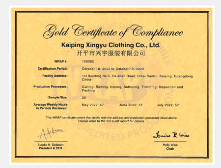 在創(chuàng)思維驗(yàn)廠網(wǎng)老師專業(yè)技術(shù)、全程跟進(jìn)耐心細(xì)致輔導(dǎo)以及公司全體員工配合下,一次性順利通過WRAP認(rèn)證,為將來(lái)公司發(fā)展奠定了良好的發(fā)展基礎(chǔ),既開拓了市場(chǎng)同時(shí)也增加了消費(fèi)者對(duì)公司的信賴,在這里再次祝賀開平市興宇服裝有限公司2022年一次性成功通過WRAP認(rèn)證,同時(shí)也期待未來(lái)再次與創(chuàng)思維驗(yàn)廠網(wǎng)合作!