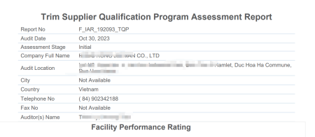 在創(chuàng)思維驗廠網(wǎng)老師專業(yè)技術、全程跟進耐心細致輔導以及公司全體員工配合下,一次性順利通過ITS-TQP驗廠審核并且獲得94分,為將來公司發(fā)展奠定了良好的發(fā)展基礎,既開拓了市場同時也增加了消費者對公司的信賴,在這里再次祝賀HONGKONG俊文(越南)有限公司2023年一次性成功通過ITS-TQP驗廠審核并且獲得94分,同時也期待未來再次與創(chuàng)思維驗廠網(wǎng)合作!
