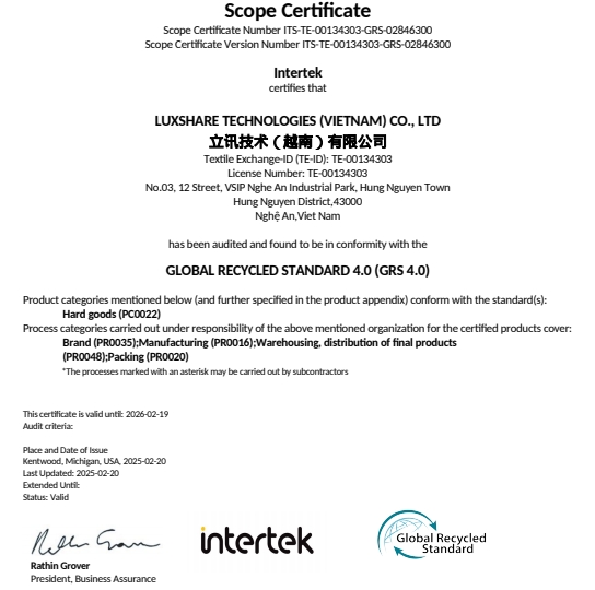 在創思維驗廠網老師專業技術、全程跟進耐心細致輔導以及公司全體員工配合下,一次性順利通過GRS認證,為將來公司發展奠定了良好的發展基礎,既開拓了市場同時也增加了消費者對公司的信賴,在這里再次祝賀越南立訊科技有限公司2025年一次性成功通過GRS認證,同時也期待未來再次與創思維驗廠網合作!