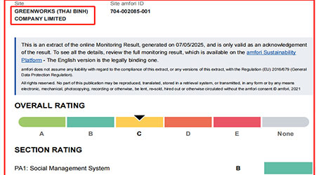 在創思維驗廠網老師專業技術、全程跟進耐心細致輔導以及公司全體員工配合下,一次性順利通過BSCI驗廠,為將來公司發展奠定了良好的發展基礎,既開拓了市場同時也增加了消費者對公司的信賴,在這里再次祝賀越南工廠GREENWORKS (THAI BINH) COMPANY LIMITED格力博 2025年一次性成功通過BSCI驗廠,同時也期待未來再次與創思維驗廠網合作!