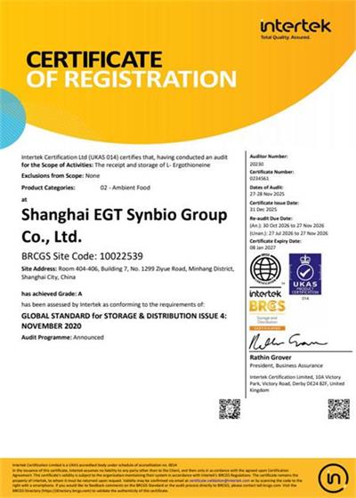 在創(chuàng)思維驗(yàn)廠網(wǎng)老師專業(yè)技術(shù)、全程跟進(jìn)耐心細(xì)致輔導(dǎo)以及公司全體員工配合下,一次性順利通過BRC認(rèn)證并取得A級(jí)證書,為將來公司發(fā)展奠定了良好的發(fā)展基礎(chǔ),既開拓了市場同時(shí)也增加了消費(fèi)者對(duì)公司的信賴,在這里再次祝賀上海麥角硫因科技有限公司2025年一次性成功通過BRC認(rèn)證并取得A級(jí)證書,同時(shí)也期待未來再次與創(chuàng)思維驗(yàn)廠網(wǎng)合作!