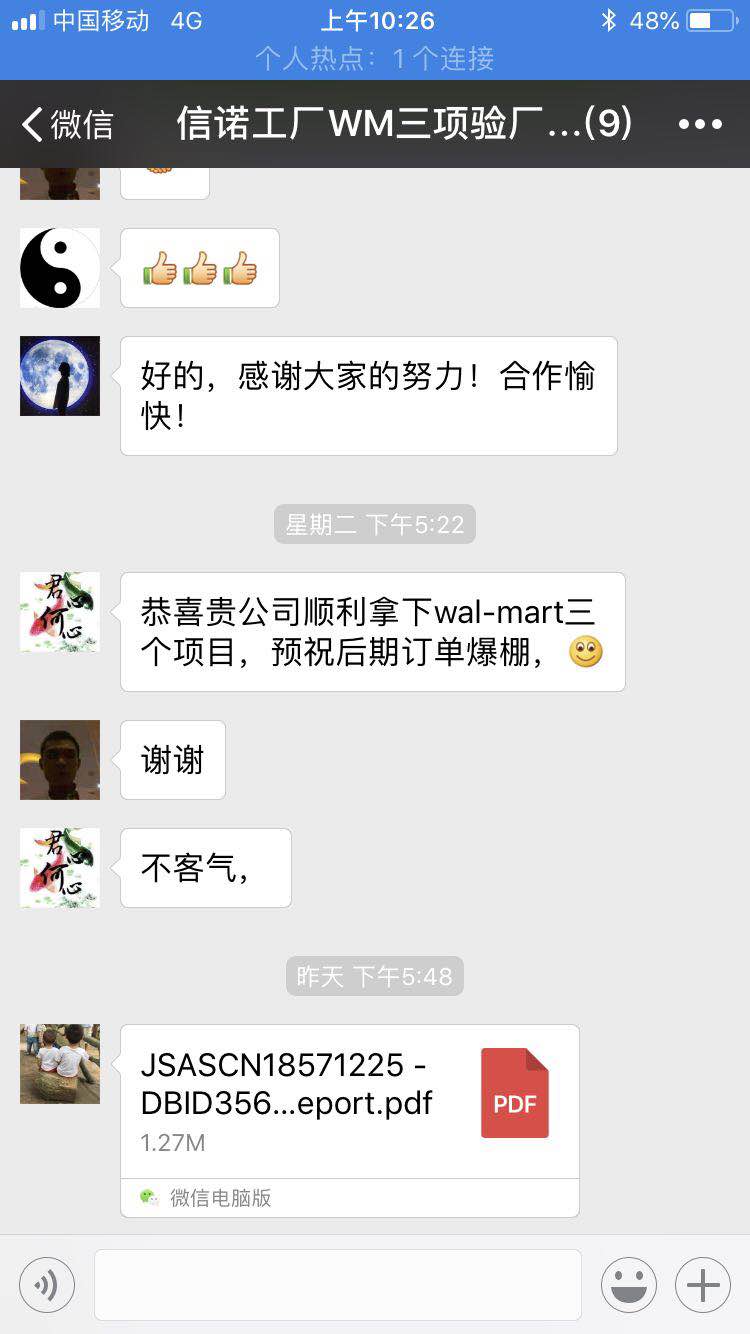 公司重質量,守信用,始終堅持"以人為本,忠誠守信,務實苦干,開拓創新"的經營理念,銷售收入,上繳利稅逐年穩步增長,取得了良好的經濟效益和社會效益,使我們公司在市場經濟的環境下穩步發展,產品質量,企業誠信受到各界用戶的好評。 "誠信,創新,合作,雙贏"是我們的企業精神。"樹立一流的敬業精神,提供一流的優質產品,追求一流的工作業績"是我們的企業宗旨。2018年初次與深圳創思維戰略合作,從簽約到wal-mart 三項全部通過創思維團隊僅僅用了18個工作日,公司的高效率,高質量的工作精神感染了客戶,客戶給了我們的高度贊賞,未來我們一起再征途;