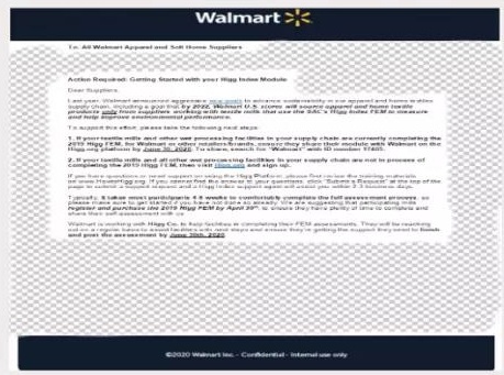 沃爾瑪要求下屬服裝和家紡行業的供應商全面實施 HIGG FEM自評,并正式下達了通知函,具體內容如下: